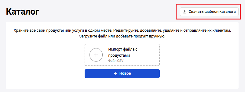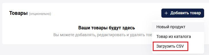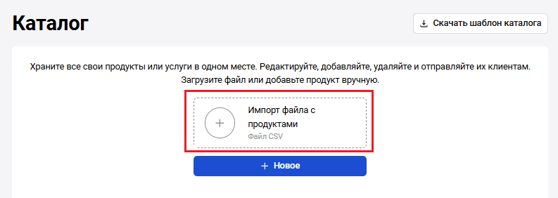 Затем загрузите готовый каталог товаров в формате .CSV, используя кнопку Импорт файла с продуктами: