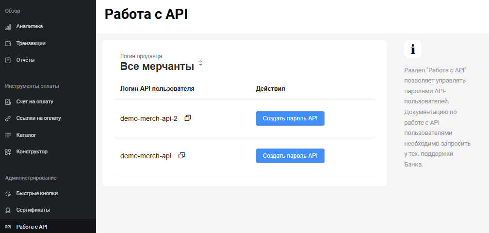 С помощью API можно создавать уникальные платежные интеграции. Например, подключить оплату со специально созданной платежной страницы. Дополнительная информация об API доступна здесь. При создании Мерчанта вы получаете письмо с логином и одноразовым паролем. После этого вы можете самостоятельно сгенерировать пароль API на странице Работа с API на портале продавца.