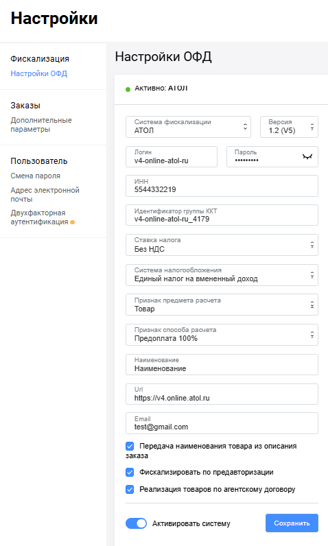 | Активировать систему | Активирует настройки фискализации. Если настройка включена, данные заказов направляются оператору фискальных данных. В противном случае настройки фискализации сохраняются, но не применяются. |