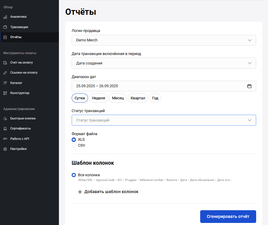 Для начала работы выберите мерчанта в выпадающем списке, скачайте шаблон каталога, нажав кнопку Скачать шаблон каталога, и заполните параметры товара: