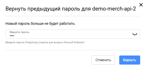 После смены пароля вы можете вернуть предыдущий пароль в течение 5 минут. Нажмите Вернуть предыдущий пароль и подтвердите действие в открывшемся окне: