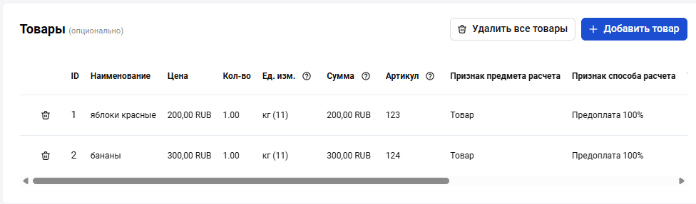 Для заказа, в котором была передана корзина товаров, отобразится таблица с корзиной заказа. Набор отображаемых параметров зависит от подключенной ОФД системы. При необходимости измените параметры корзины. Чтобы сбросить изменения в товарных позициях, нажмите Сбросить корзину.