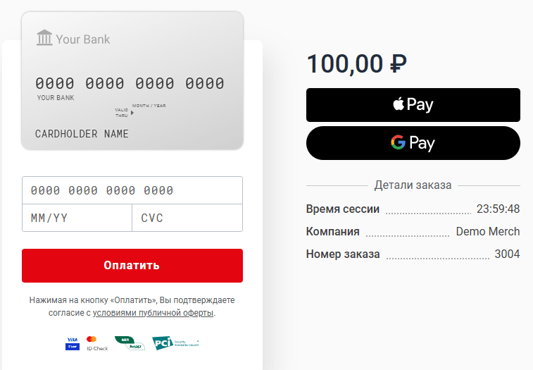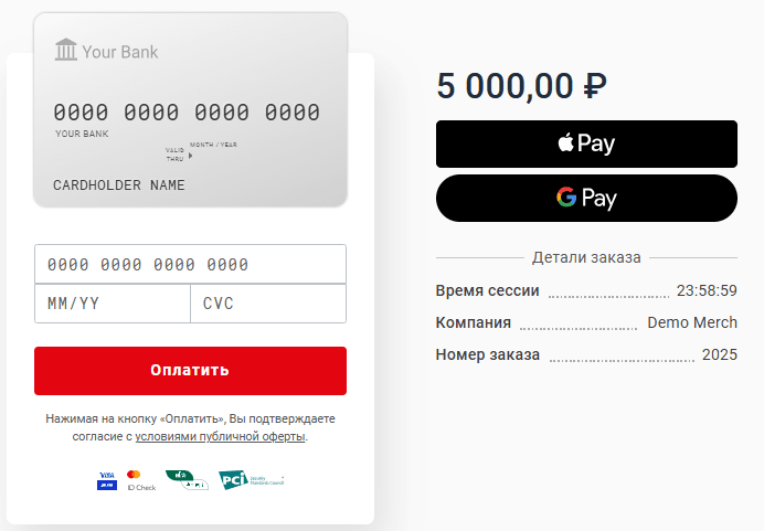 Платежный шлюз поддерживает токенизированную оплату с помощью электронных кошельков Apple Pay, Google Pay и Samsung Pay.