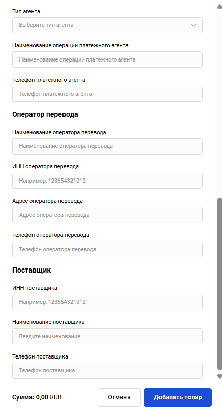 В случае реализация товаров по агентскому договору в деталях товара также могут отображаться дополнительные параметры ОФД: