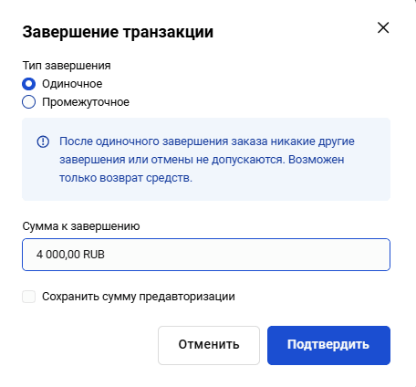 Чтобы завершить транзакцию, на странице Информация о транзакции нажмите на кнопку Завершить.