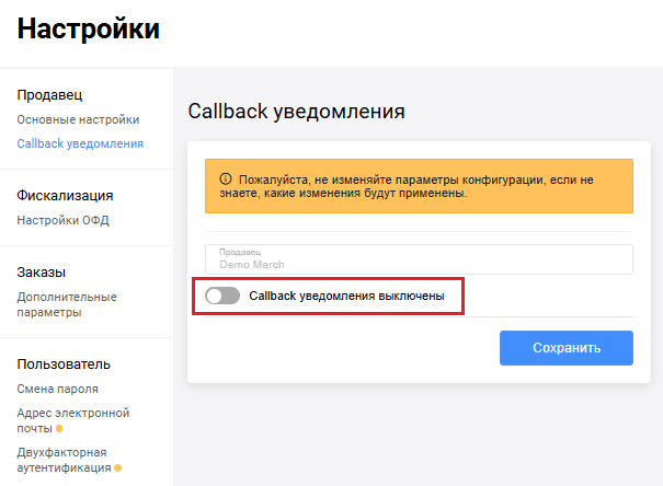 Дополнительная информация об уведомлениях обратного вызова доступна здесь. Вкладка Callback-уведомления доступна здесь: Настройки → Продавец → Callback-уведомления.