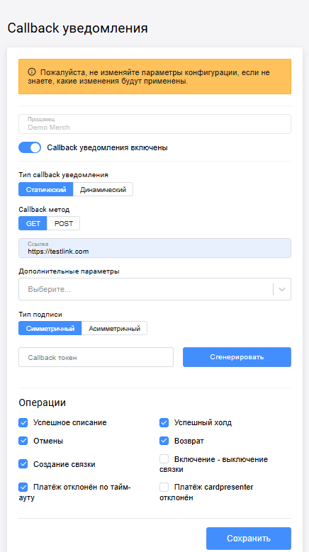 Настройки уведомлений обратного вызова описаны ниже.