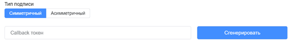 Выберите один из типов подписи: Симметричный или Асимметричный. Если выбран симметричный тип подписи, можно сгенерировать токен callback-а. Кроме того, если выбран Симметричный тип подписи, можно ввести токен вручную.
