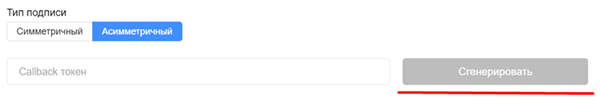 Если выбран тип асимметричной подписи, кнопка Сгенерировать будет неактивна. Ключ для асимметричной подписи можно получить в службе поддержки.